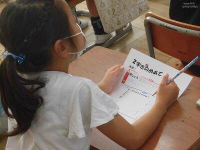 書家の先生をお呼びしての書写指導がありました。「点とはねに気をつけて「小」を書く」というめあてです。点の向きやはね方など、具体的な筆の動かし方を教わりながら、集中して取り組んでいました。
