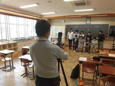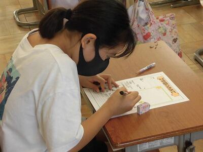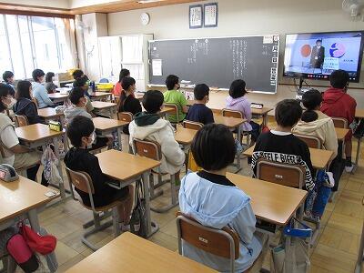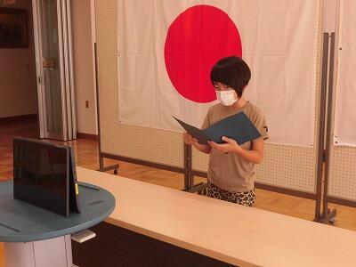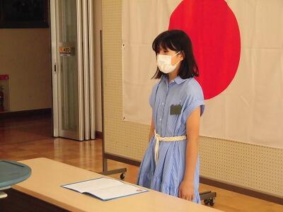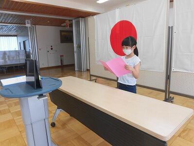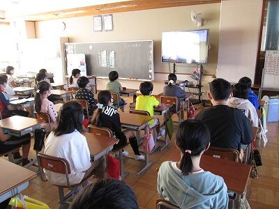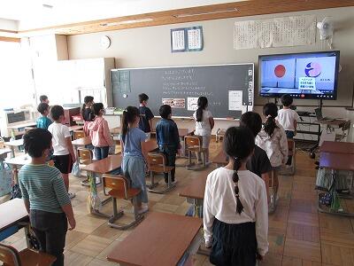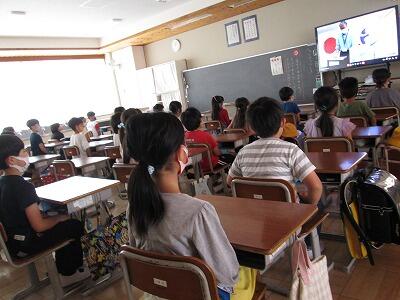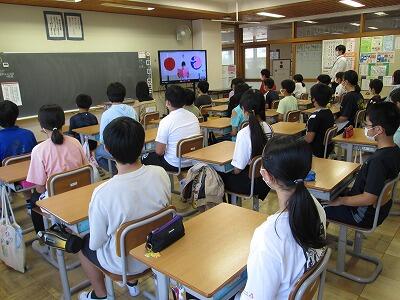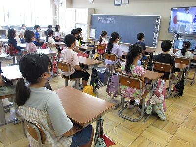 次に、1学期を振り返って3名の児童が作文を発表しました。どのクラスも姿勢を意識し集中して中継に見入っていました。