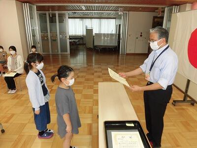 はじめに4名の表彰(新体力テストS認定証、読書感想文コンクール)を行い、その後、式を行いました。はじめに学校長の話として、1学期始業式にお話ししたがんばってほしいことを振り返りました。学習、心、体力・健康など、子どもたちは本当に成長しました。
