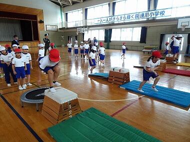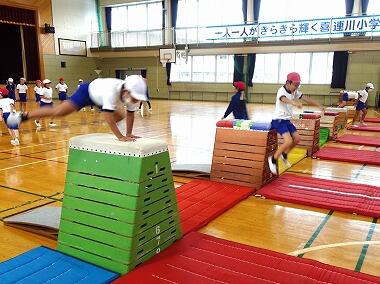 2年生は、1組、2組ともに、跳び箱を使った運動遊びをしていました。踏み越し跳びやまたぎ乗りの練習を一生懸命していました。