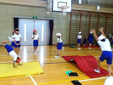 1年生は、マットを使った運動遊びをしていました。いろいろな転がり方にチャレンジしていました。