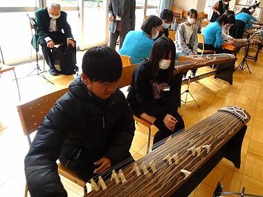 6年生は、音楽の授業で「私たちの国の音楽」について勉強します。今日は、ゲストティーチャーのお越しいただき、琴の体験教室を行いました。ゲストティーチャーによる「六段の調べ」の演奏を聴いた後、子どもたちは6組に分かれ、実際に「さくら さくら」の演奏を体験しました。最後には、希望者がゲストティーチャーと一緒に演奏し、練習の成果を発表しました。