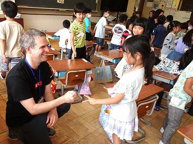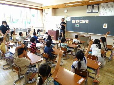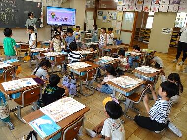 1年1組は、1時間目に英語の勉強をしました。さくら市では、1、2年生も年間12時間ほど英語の授業があります。今日は、楽しいや眠い、暑いなど、調子の答え方と尋ね方をALTの先生と一緒に練習しました。