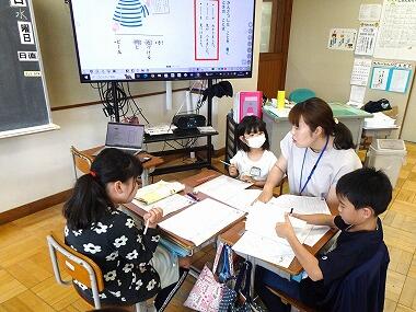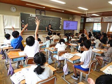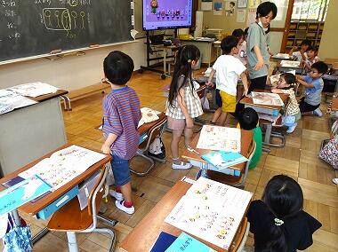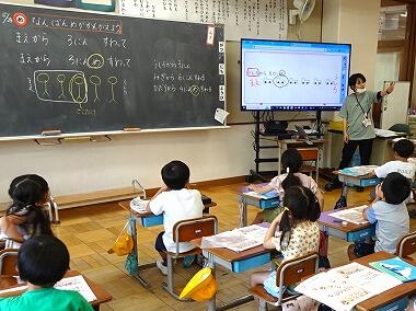 3時間目、1年2組は算数で「なんばんめ」を勉強をしました。教科書で学習した後には、「前から2れつめ」が座ったり、「後ろから3れつ」が座ったりと、実際に体を使って体験しながら確認もしました。
