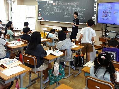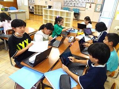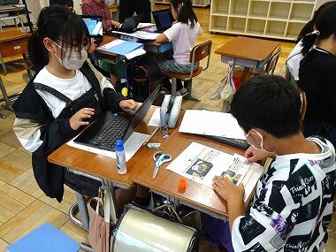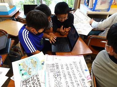 4年生は、総合的な学習の時間に「大好きな喜連川を伝えよう」の学習をしています。この学習は、喜連川について調べたことを、3年生にわかりやすく自信をもって伝える学習となっています。温泉や食べ物、店、歴史などをテーマに、グループに分かれて学習を進めています。パンフレットやインターネットを活用したり、手紙や電話でインタビューしたりしながら調べを進めていました。