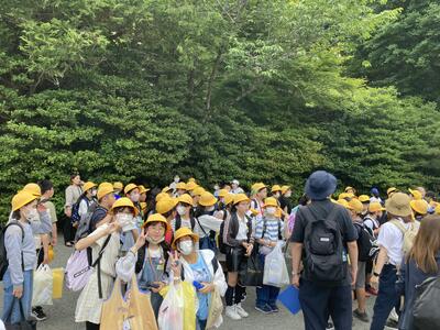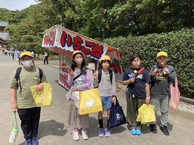 少し疲れたようすも見られますが、全員元気に鶴岡八幡宮に到着しました。お土産もたくさん手にしています。