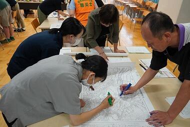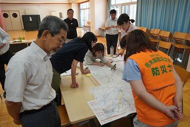 栃木県防災防士会の防災士の方を講師に、ハザードマップの活用と防災図上訓練(DIG訓練)を体験しました。実際に地図上に様々な情報を記入し確認していくことで、ハザードマップを見ただけで気づかない、いろいろなことに気づくことができました。