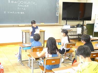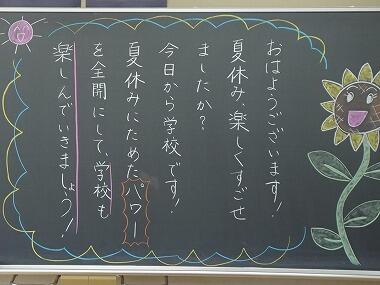 夏休みが終わり、子どもたちは宿題や持ち帰った荷物を手に、元気に登校していました。今日から1学期後半がスタートしました。夏休み明けも、まだまだ暑い日が続きそうです。水泳の授業や運動会の練習も始まりますので、熱中症に気をつけて活動していきたいと思います。