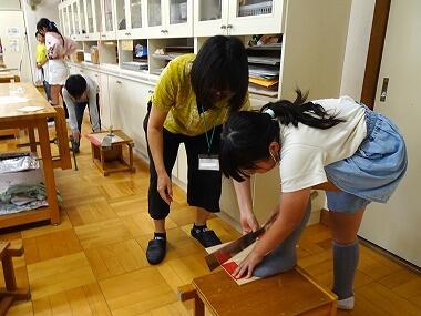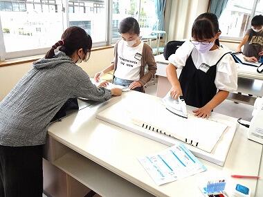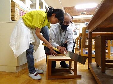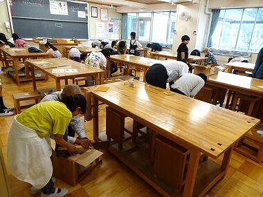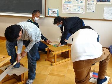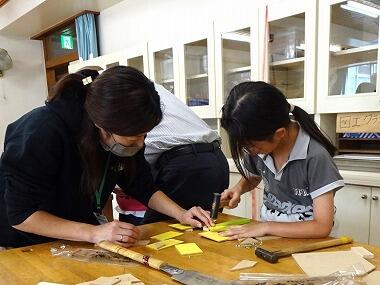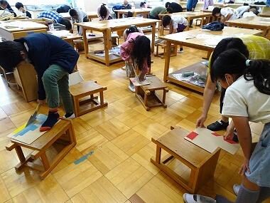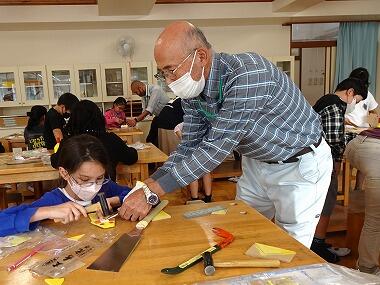 4年生の図画工作「ギコギコ トントン クリエーター」の授業の様子です。今日は授業応援隊の方に来ていただいて、お手伝いをしていただきながら、のこぎりで板を切り分けました。子どもたちは、苦戦しながらもがんばって挑戦していました。今日は少し肌寒い陽気でしたが、汗をかきながら集中して取り組んでいました。