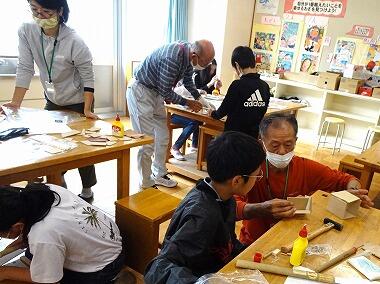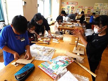今日は、2組と3組が授業応援隊の方にお手伝いいただきながら、釘打ちに挑戦しました。慣れない釘打ちに悪戦苦闘する子も多かったですが、がんばって思い思いの作品を作っていました。