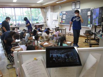 2年生が自分で育てている野菜をタブレットを使って観察していました。また、同じ時間に4年生も理科の学習で夏の生き物の観察をタブレットを利用して行っていました。どちらの学年も、写真を撮り、気づいたことや見つけたことなどを入力し、共有アプリで先生に提出して、みんなで見合いました。タブレット端末も観察カードやノート代わりに日常的に使われています。