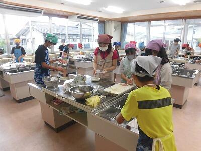 家庭科室から、いいにおいがしてきます。行ってみると、6年生が家庭科の調理実習をしていました。「朝食から健康な一日の生活を」という単元の学習で、いためる調理をしておかずを作っているところでした。ジャガイモをゆでたり、ベーコンをいためたりと、グループで協力しながら、手際よく調理を行っていました。