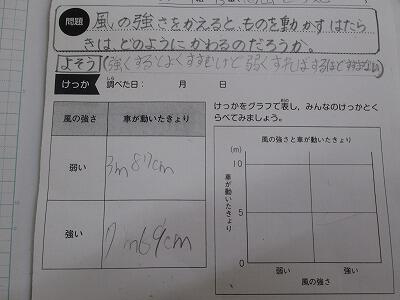 多目的室で3年生の子どもたちが車を走らせていました。のぞいてみると、理科の学習で、風の働きの実験をしていました。課題は「風の強さを変えると、ものを動かす働きはどのように変わるのか」で、送風機の強さを変えて車が走る距離がどう変わるか調べていました。子どもたちはグループで友だちと協力して距離を測ったり記録したりしていました。理科では、条件をそろえたり正しく測ったりする、結果を記録したり分かりやすくグラフにしたりすることが大切です。理科の学習がしっかりと進んでいてうれしく感じています。