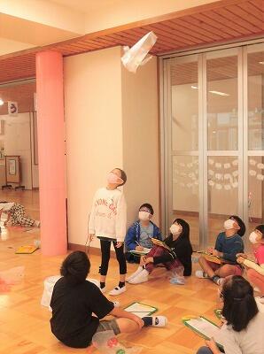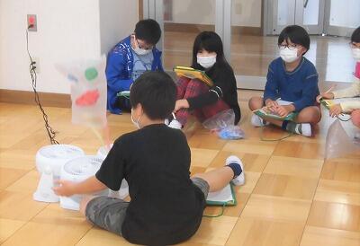 校舎内を歩いていると、多目的室で歓声があがっています。のぞいてみると、3年生が図工の時間に作った作品を、サーキュレーターの風にのせて飛ばしているところでした。「ふき上がる風にのせて」という単元です。自分の作品の紹介をした後に、サーキュレーターの風に乗せます。自分や友だちの作品が、風に乗ってふき上がる様子に、子どもたちは目を輝かせていました。