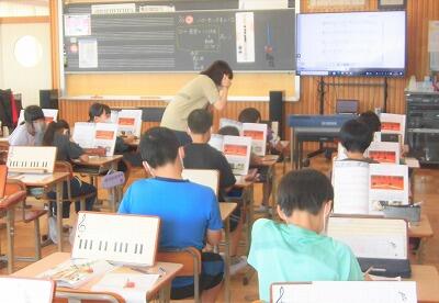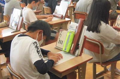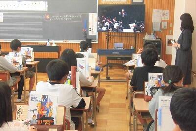音楽室から、オーケストラの演奏が聞こえてきます。「演奏の魅力」の単元の学習で、ピアニストの辻井伸行さんの演奏や、ベートーベンの「運命」のオーケストラ演奏などを、大画面の提示装置で聞き入っていました。子どもたちは、真剣に聞き入っていました。新型コロナウイルス感染症への対応で、鑑賞を中心に学習しています。