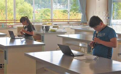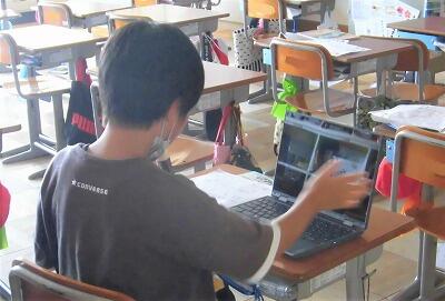 誰も居ないはずの教室からリコーダーの音が聞こえます。不思議に思いのぞいてみると、4年生が一人でクロムブックに向かってリコーダーをふいています。新型コロナウイルス感染症への対応で、これまで行ってきた通常の座り方でのリコーダーや歌は行わないことにしています。部屋に一人か二人の少人数で、向きを考慮すれば演奏は可能です。よくみると、クロムブックに自分の笛の演奏の動画を撮影しています。終わると、それを先生のパソコンに提出(送信)していました。音楽室をのぞくと、「ハローサミングをふこう」とめあてが記されています。音楽室では楽譜を写す作業をしていました。コロナ前は、よくリコーダーのテストとかをやっていました。動画であれば指の動きや息継ぎ、音があく分かります。クロムブックの使い方の幅がどんどん広がります。