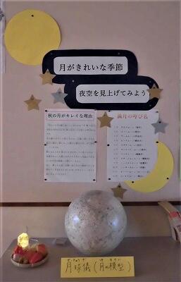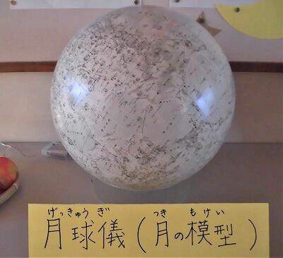 理科室前の掲示のコーナーは、その季節や学習の内容に合わせて、理科支援員の先生が工夫をして変えてくださっています。今日、理科室前を通りかかったときに「月球儀」とあり、ふと足を止めました。名前のとおり、月の地球儀です。「晴の海」とか「静かの海」などの名称が細かく記載されています。こんなものがあるのかと驚きました。4年生で月の満ち欠けに関する学習をしています。興味深い掲示物です。
