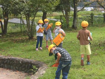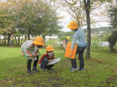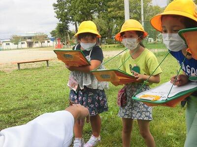 1年生が校庭東側の樹木の方へ歩いて行きます。探検バックを肩から下げており、やる気満々です。生活科の学習で虫探しをするのです。ワークシートには、8種類の虫を書き入れるスペースがあります。赤とんぼやバッタ、カマキリなど、たくさんの種類を見付けて大興奮でした。