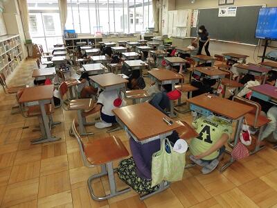 子どもたちは、落ちてくる物から頭と背中を守るため、机を利用して安全を確保していました。