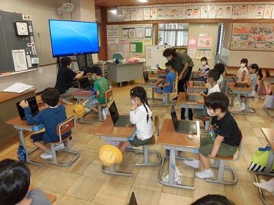 1年生が、クロームブックを使ったオンライン授業の練習をしました。Googlemeetを使って、みんなと繋がる方法を学びました。