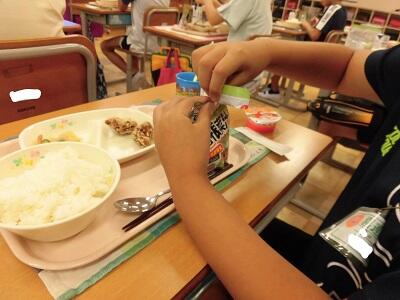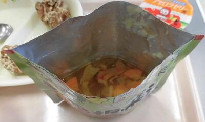 給食センターで温めた状態で用意していただき、自分たちで開封して食べました。