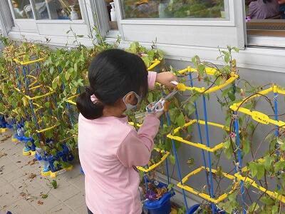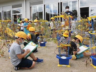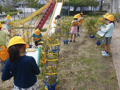 1年生が、自分で育てているアサガオを観察していました。できた実とその中の種をとって一生懸命スケッチしていました。「たくさん種が取れたよ」「黒くて面白い形をしている」など、いろいろな気づきがありました。