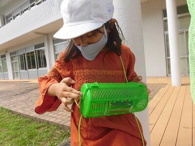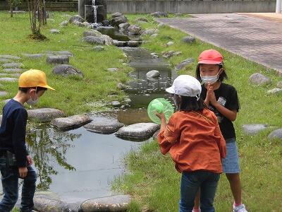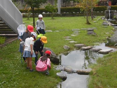 2年生が虫取り網を持って元気に外に出て行きました。ついて行ってみると、夏の生き物探しで、校庭や中庭の川や池で生き物を取りに走り回っていました。なかなか捕えるのが難しかったようですが、満足そうに活動している様子が見られました。