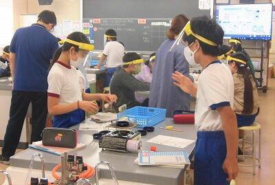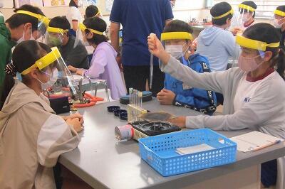 新型コロナウイルス感染症の対策として、夏の水泳授業の送迎で活用したフェイスシールドを活用して、6年生が理科の実験に取り組みました。「水よう液の性質」の学習で、いろいろな水溶液を比べていく実験です。マスクやフェイスシールドで、匂いなどは嗅ぎづらそうでしたが、グループで話し合いながら進めることができました。