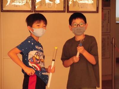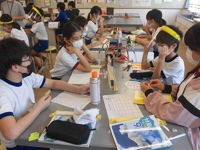 ポン、ポン、ポン・・・という景気が良い音に誘われて、多目的室に行きました。すると、4年生が空気鉄砲でスポンジの玉を飛ばしていました。ポンという音は、空気に押されてスポンジの玉が飛び出すときの音でした。より遠くへ飛ばすためには、どのようにスポンジを配置すればよいか、話し合いながら飛ばしていました。