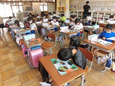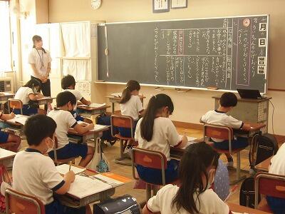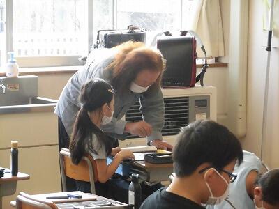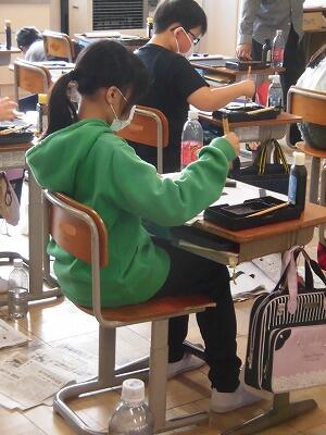書家の先生をお呼びしての書写指導がありました。「点とはねに気をつけて「小」を書く」というめあてです。点の向きやはね方など、具体的な筆の動かし方を教わりながら、集中して取り組んでいました。