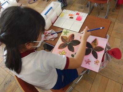 3週間ぐらい前の3年生の図工の時間に、綺麗な葉や落ち葉を探していたので、何に使うのかとずっと気になっていました。「身近なしぜんの形・色」という単元の活動です。自分が見付けた葉をカラーコピーしておき、それをいろいろな形にして画用紙に貼り付け、自分のイメージにあった絵に仕上げていくのです。今日は、水彩の絵の具を使って仕上げを行っていました。すばらしい作品に仕上がりました。