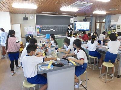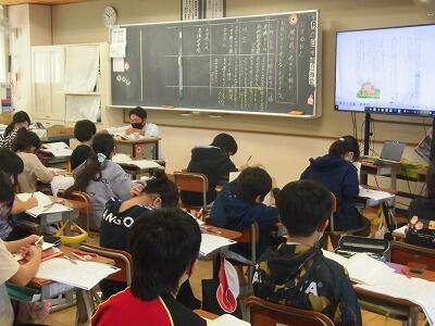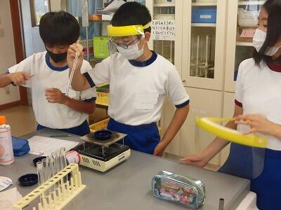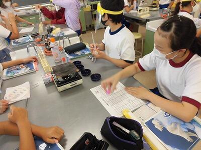 6年生の理科「水溶液の性質」の学習です。今日は、まとめをかねて、活用力を培う時間です。食塩水、薄い塩酸、炭酸水、重曹水、薄いアンモニア水、石灰水の6つの液体を、においや見た目、性質(リトマス紙)等で当てていくという学習です。途中から、熱して蒸発させたり、二酸化炭素を混ぜてみたりして、液体を特定していきました。グループで話し合いながら、効率的に進めていました。
