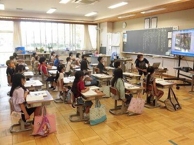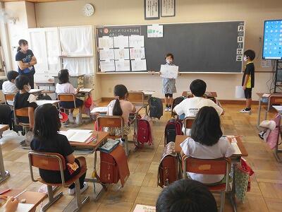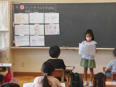 3年生の教室で発表会をしていたので足を止めました。社会科の時間に調べてきたスーパーマーケットの様々な工夫について、一人一人がまとめたものを発表していたのです。「ほしいものがどのあたりにあるか分かるように、種類ごとの看板が吊り下げられています」など、細かなところまで調べたことが分かります。発表も堂々としています。