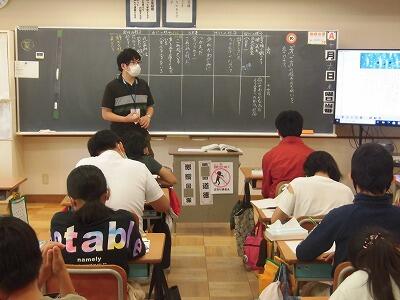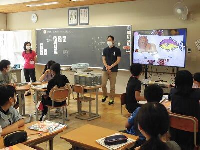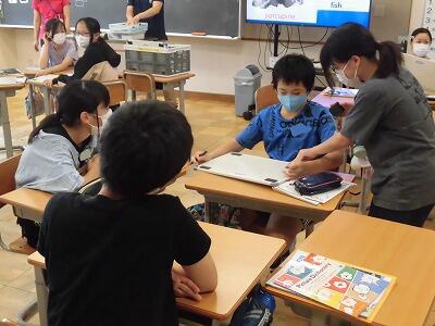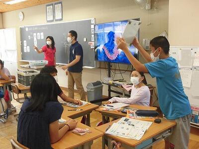 6年生の教室で歓声が聞こえます。のぞいてみると、英語のパネルから連想される地球の生き物について、グループで考えていくというアクティビティーでした。「lion」と「fish」?・・・答えは「ミノカサゴ」、子どもたちはたくさんの正解を出していました。