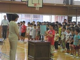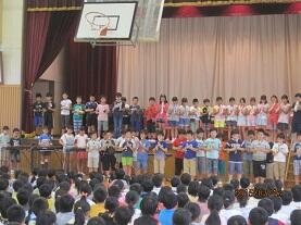 今朝は、「音楽朝会」からスタートしました。毎朝、各学級でも“朝の歌”を決めて歌っていますが、今日は、全校生で「ビリーブ」を歌いました。