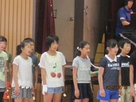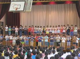 続いて、6年生が「花は咲く」の合唱を披露してくれました。とてもさわやかな歌声が体育館内に響いていました。更に、「ルパン3世のテーマ」の合奏をステージドリルを交えて行ってくれました。各学年の演奏には大きな拍手が贈られました。