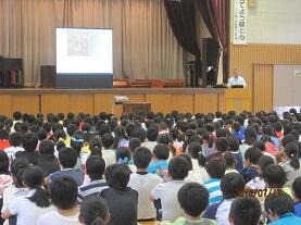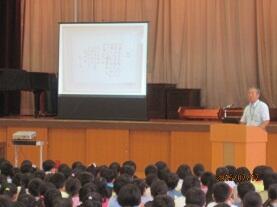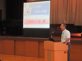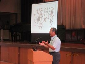 朝会では、先日開幕した「ことばのちから―相田みつを展」について紹介するとともに、相田みつを氏の代表的な詩や“ことば”をいくつか取り上げ、低学年児童には少し難しい言葉でしたが、錦織圭の座右の銘「一生燃焼 一生感動 一生不悟」を取り上げ、心に止まった詩や“ことば”を探しに行ってみてはどうかということで、お話しました。