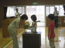 式では、お世話になった3年生代表からのお別れの言葉と花束が贈られました。伊藤先生のお別れの言葉では、南小児童の元気なあいさつや、元気な歌声からたくさんの「元気」をもらえたという言葉を残してくれました。最後には、元気いっぱいの校歌を歌って、伊藤先生をお送りしました。