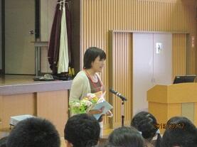 その後、今年度4月から、3学年の副担任としてお勤めいただいていた伊藤先生が、本日付で退職となるため、朝会の場を借りて「離任式」を行いました。
