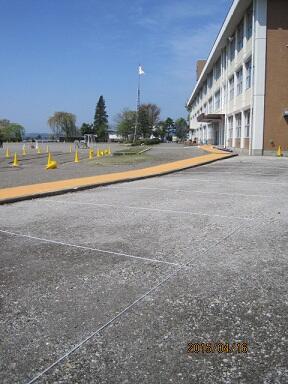 先日の、PTA総会の時に提案いたしましたが、昨日より登下校時の児童送迎保護者関係駐車場は校庭の西側から、校舎東側のスペースを送迎用駐車場として運用しております。
