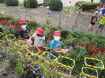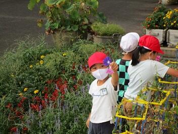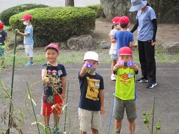 本日、1校時めに1年生が、アサガオの花を摘みました。