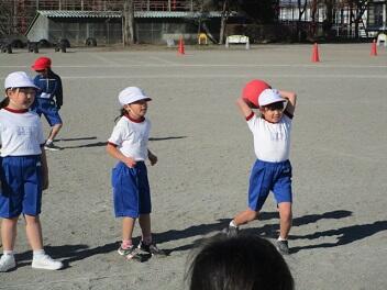 校庭に、穴は開けられないので、カップの代わりに、花の形をしたプラスチックでできた器具を置き、その中にサッカーボールを入れる方法で体験しました。