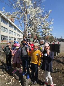 南小の校庭の白木蓮、しだれ桜がきれいに咲いています。