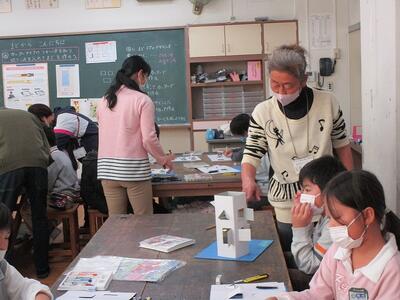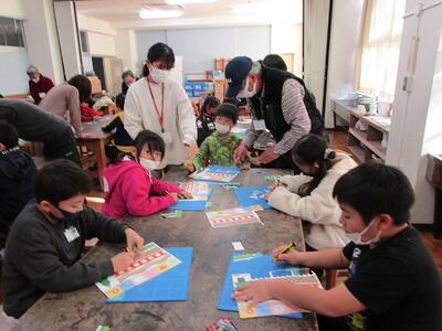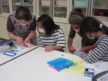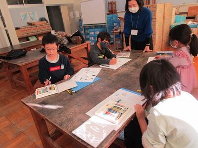 7名の学習支援ボランティアの方々が、カッターナイフの安全な使い方やそれぞれが表現する様子を温かく見守ってく