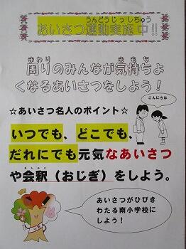 先日、地域の方から「元気な声で、すすんであいさつしてくれる子が増えました。とても気持ちがいいですね。」とほめていただきました。地域の方に見守られながら、もっともっと「すてきなあいさつ」「心のこもったあいさつ」「笑顔であいさつ」をする子どもたちが増えることを楽しみにしています。