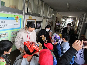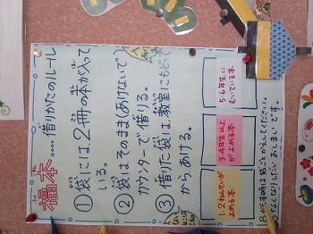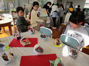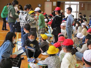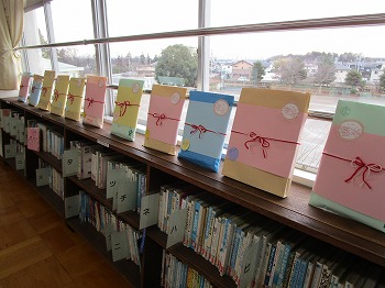 6年生に、図書事務の先生から、6年間に読んだ本の記録の一覧が、一人一人にメッセージつきでプレゼントされます。絵本の表紙をバッグにした、全てが手作りの心のこもったすてきなプレゼントです。(図書ボランティアさんにもお世話になりました。)