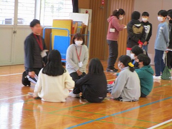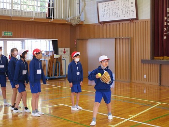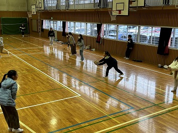 体育館では5年生がチームで声を掛け合いながらソフトバレーボールの練習に励んでいました。