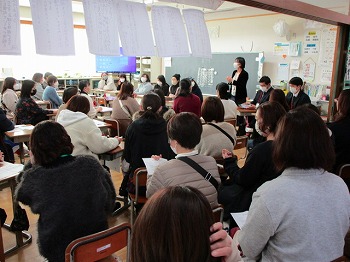 教職員で授業を見合い、子どもの学びの様子から、教師の手立てや問い方などのよかったことや、テーマに近づくため