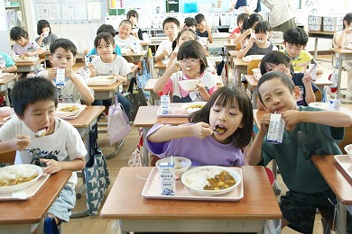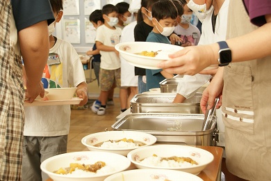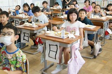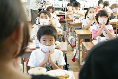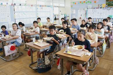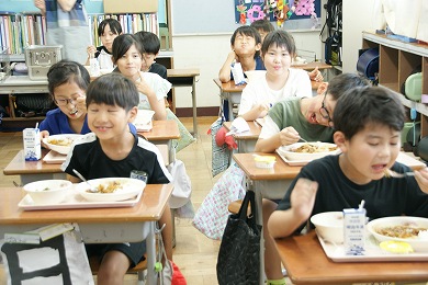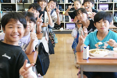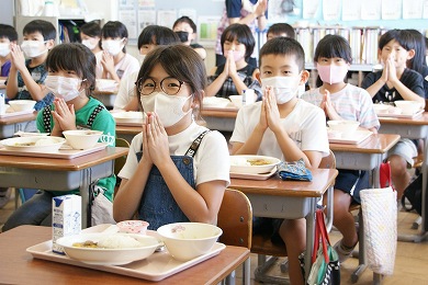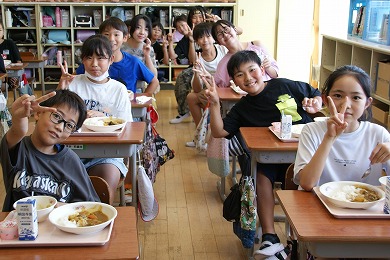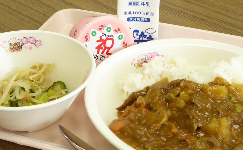 この日のメニューは「ごはん・きのこハッシュドポーク・こんにゃくサラダ・牛乳・豆乳パンナコッタ」でした。そして南小学校の学校給食では初めてのカレー皿での提供でした。デザート(豆乳パンナコッタ)も付いて、子供たちは笑顔いっぱい、おいしくいただきました。