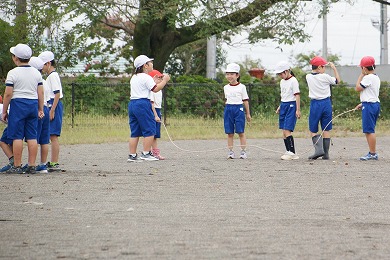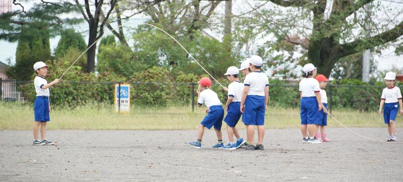 「長なわ」にもチャレンジ!長なわは息を合わせてなわを操作したり、なわに合わせて自分の体をいろいろ動かしたりするので、多様な動きをつくる運動としてとても有効ですね。